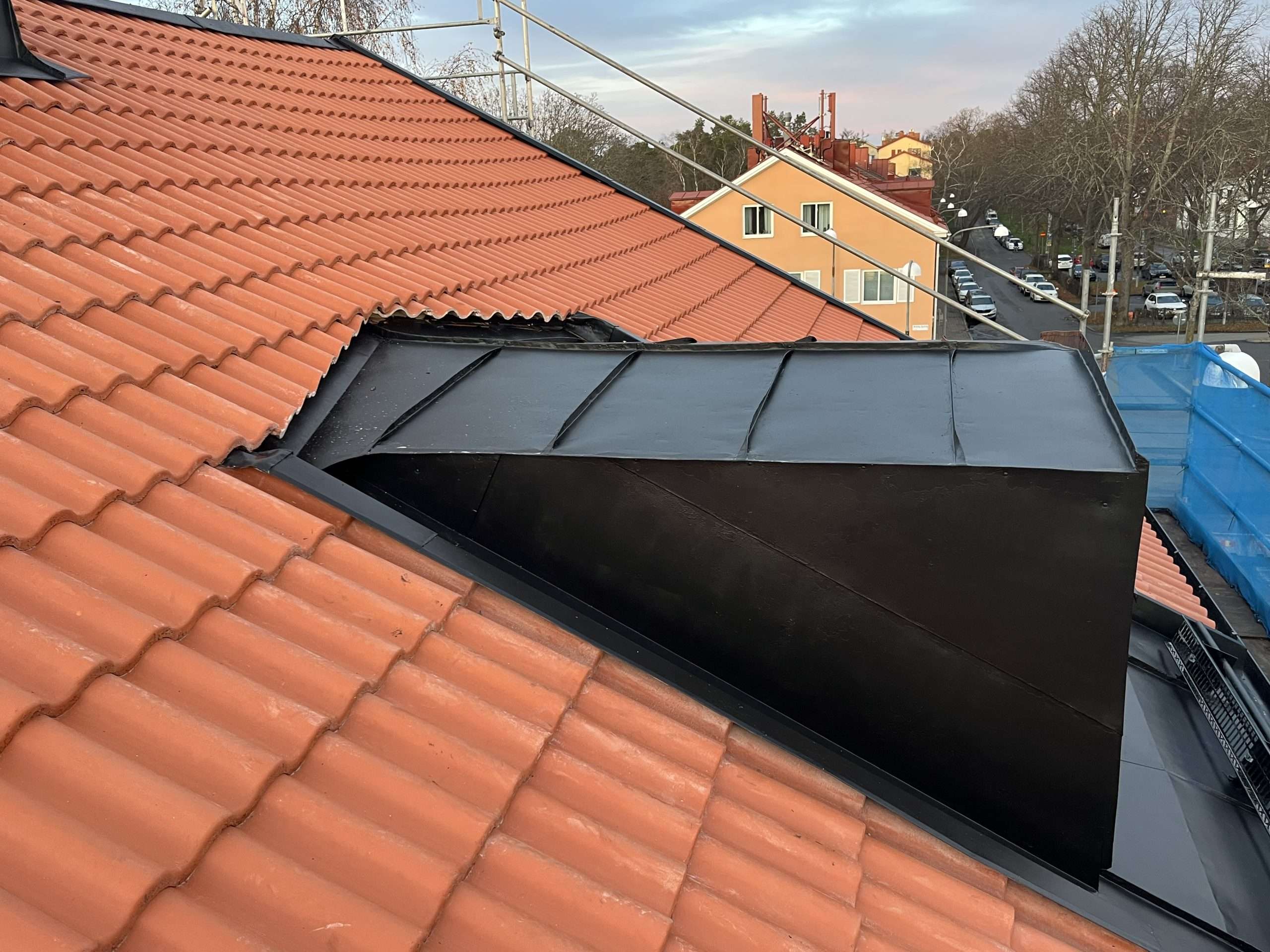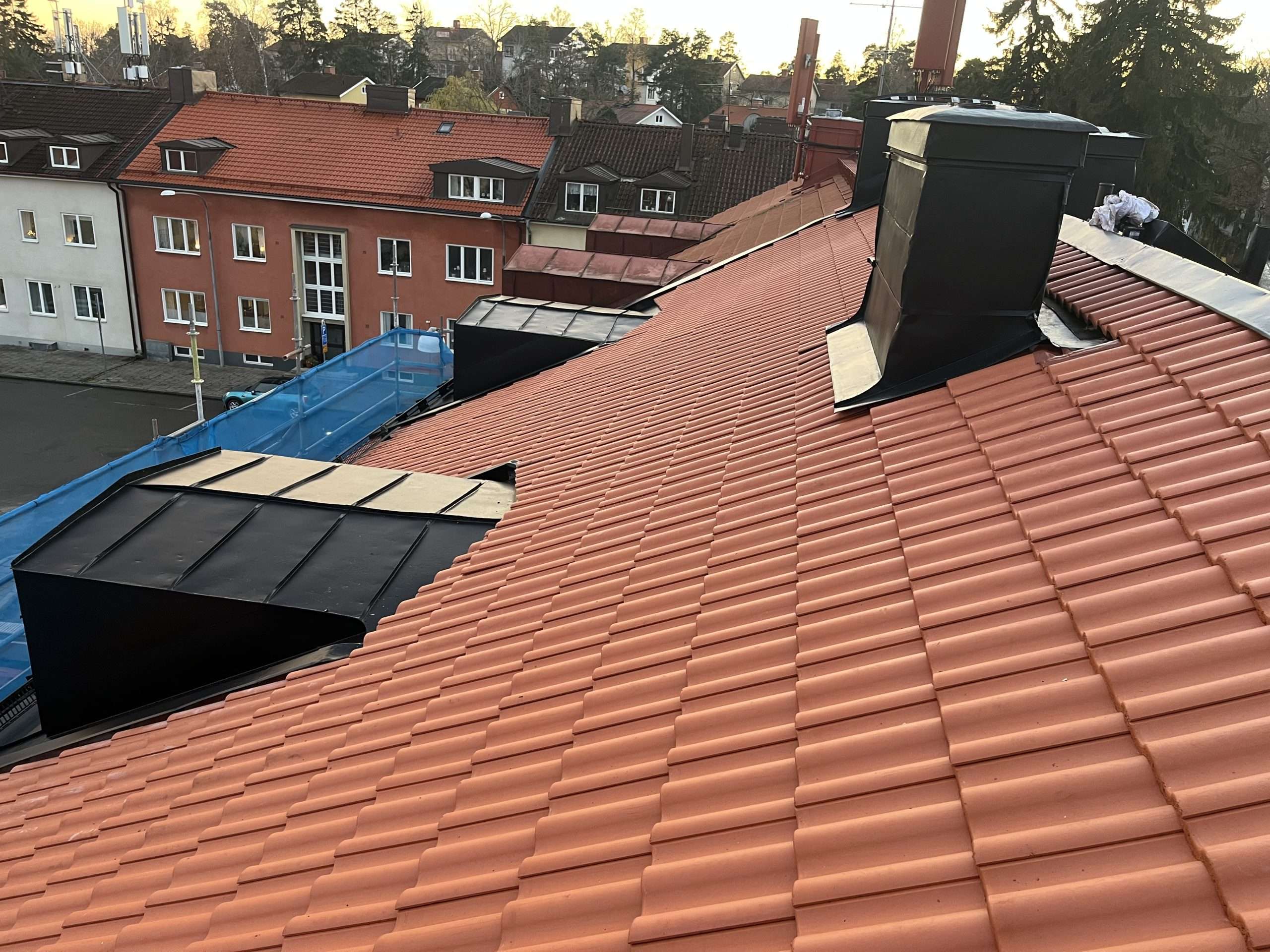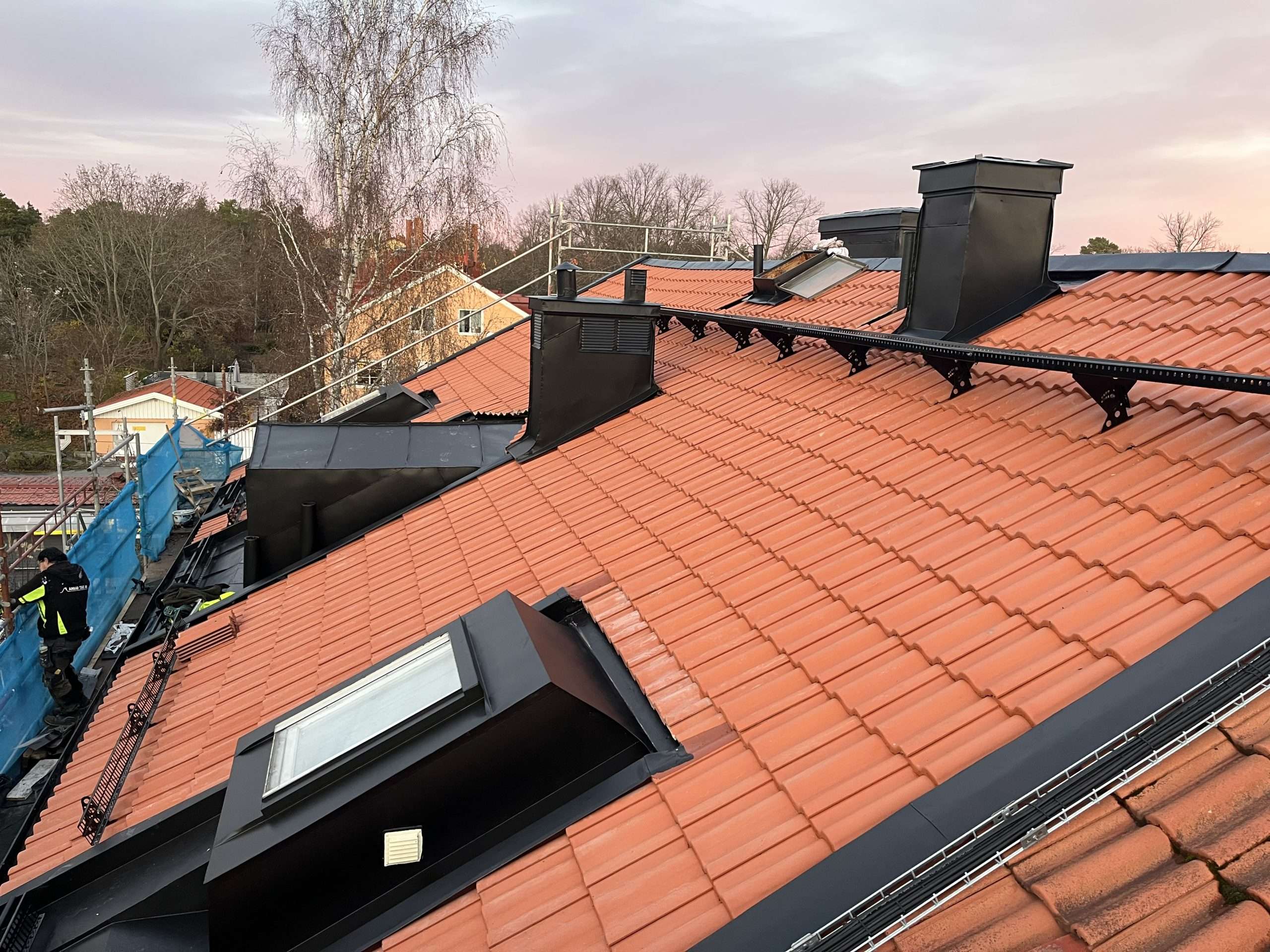 Montering av Takpannor, taksäkerhet och målning av plåtdetaljer på Nockeby torg 9.