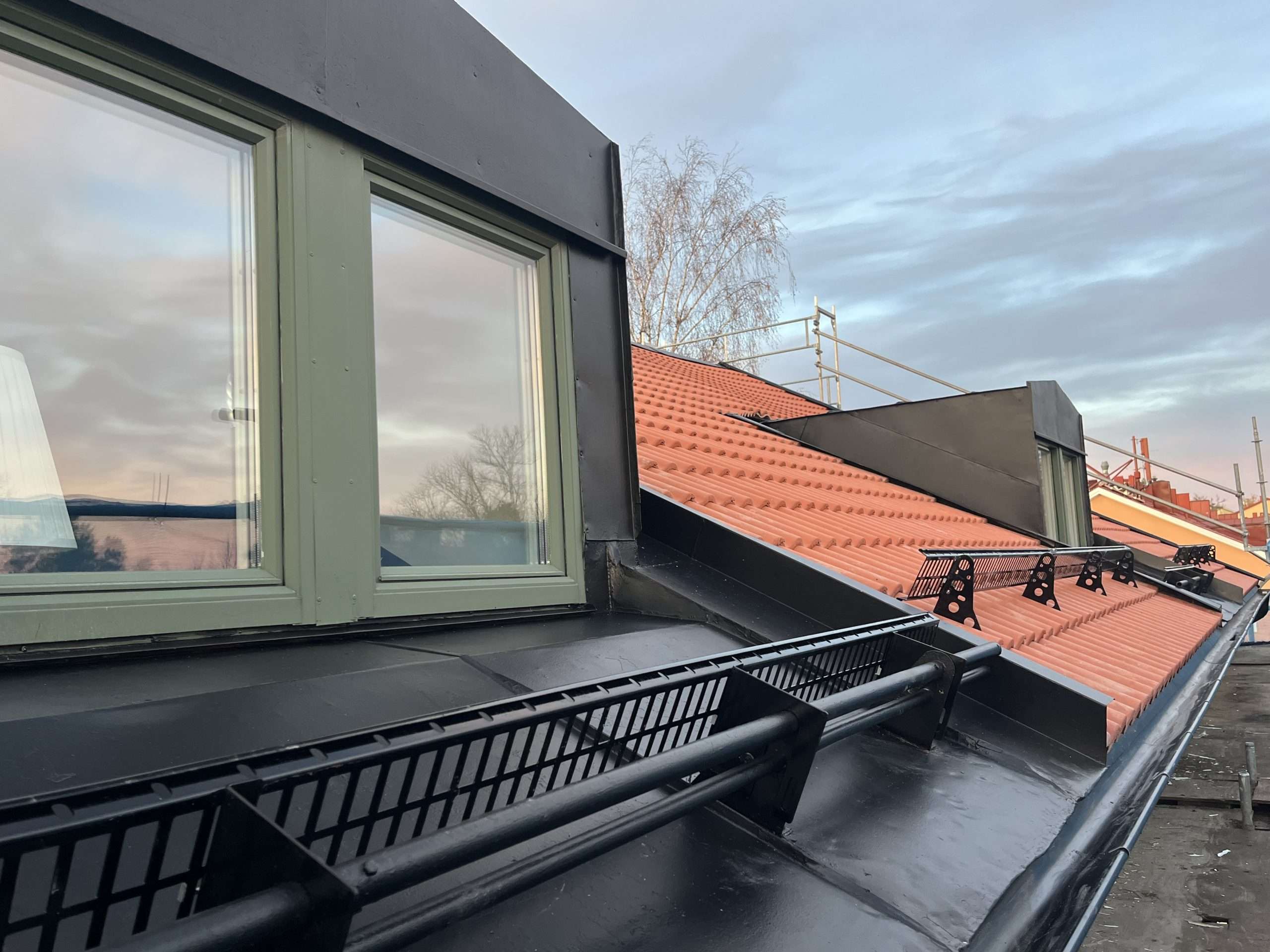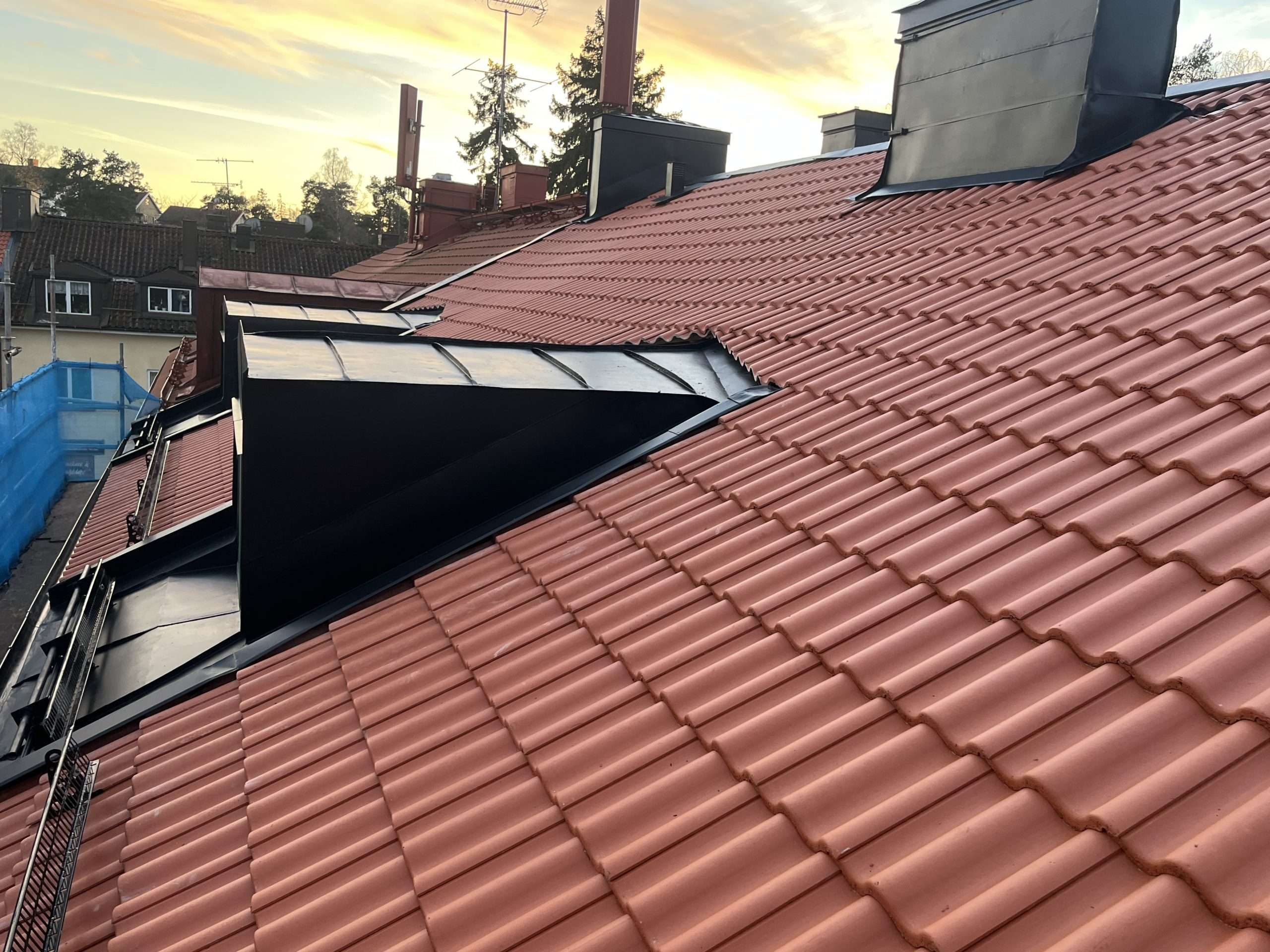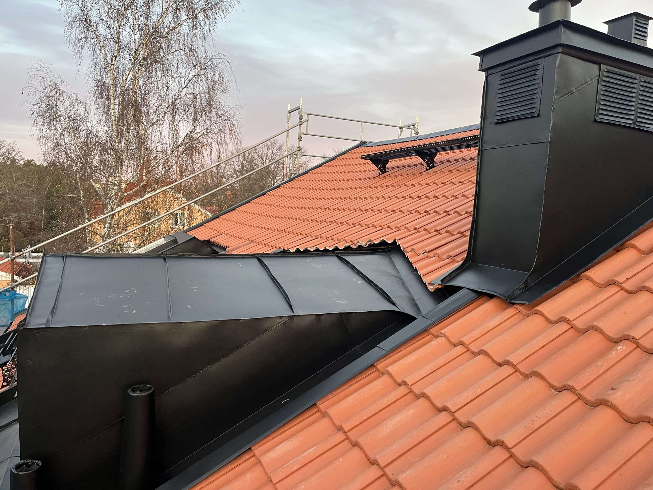 Montering av Takpannor, taksäkerhet och målning av plåtdetaljer på Nockeby torg 9.